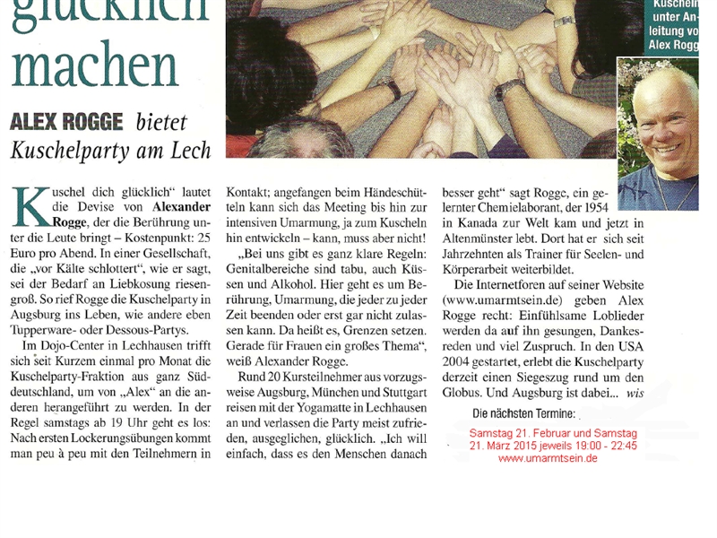 Bei unseren Workshops gibt es keinerlei Zwänge. Du kannst z.B. jemanden umarmen, dich umarmen lassen oder auch nicht. Du bestimmst allein wieviel Nähe Du zulassen möchtest. Wie das alles funktioniert und auch daß mann/frau eine angenehme, unvergessliche Zeit erleben kann, dafür sorgt ein erfahrener Trainer, der die Gruppe anleitet und moderiert. Besonders wichtig ist der geschützte Raum in dem sich alle Menschen sicher und gut aufgehoben fühlen, ja er ist die Voraussetzung für das Wohlgefühl aller TeilnehmerInnen. Alles ist einfach und spielerisch. Die TeilnehmerInnen fühlen sich meist in die Kindergartenzeit zurückversetzt, als alle Gefühle noch aus dem Bauch kamen. Es sind wunderbare Momente, die die Augen der Menschen nach so einem Erlebnis strahlen lassen.